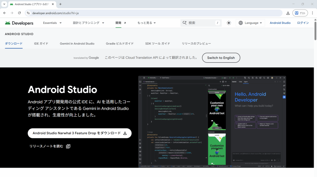 以下のリンクからAndroid Studioの公式サイトにアクセスし、Android Studioをダウンロードしましょう