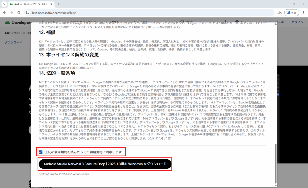 利用規約のダイアログに同意のチェックを入れると、ダウンロードできます