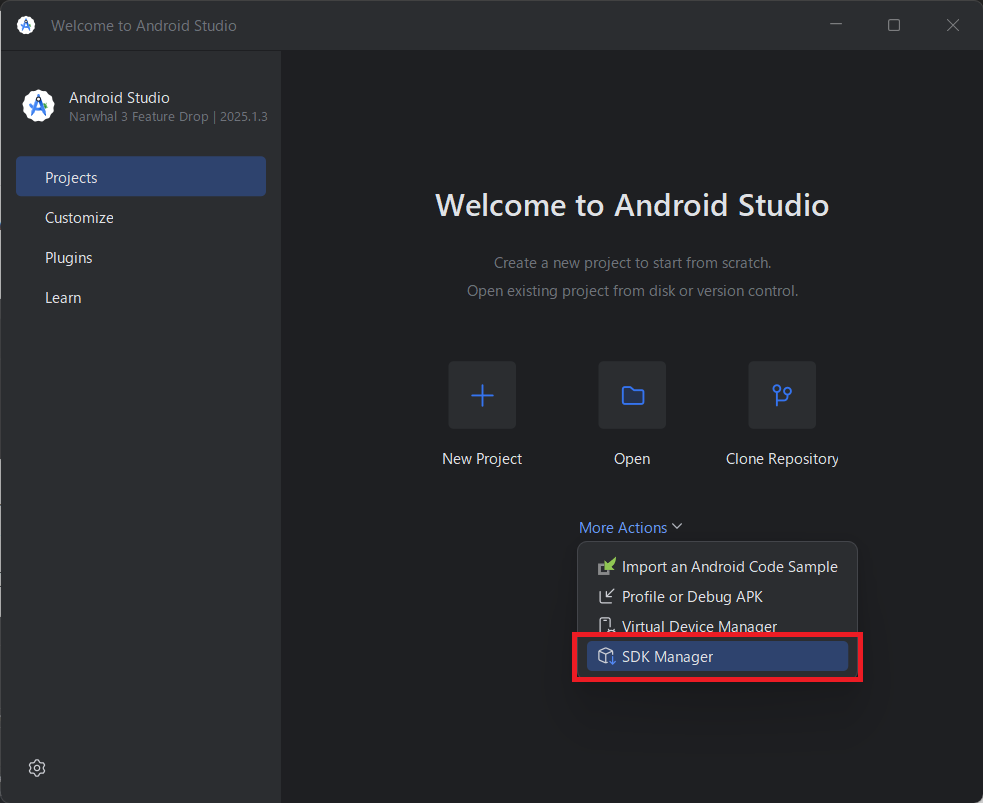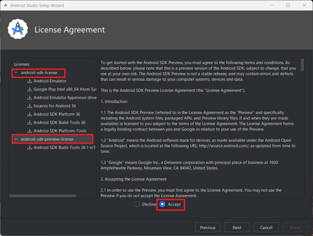 cmdline-tools コンポーネントがありません (“cmdline-tools component is missing”)- Android ライセンスのステータスは不明です (“Android license status unknown”)