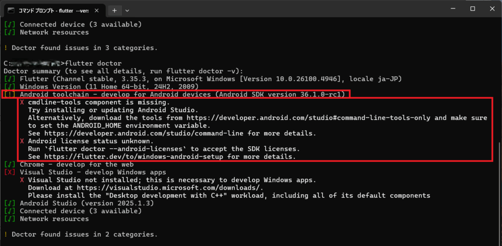 「Android Studio」のインストール完了後に「flutter doctor」コマンドを実行すると状態が変わっていると思います。