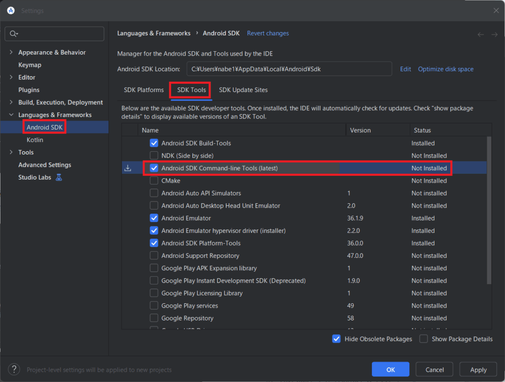 - cmdline-tools コンポーネントがありません (“cmdline-tools component is missing”)