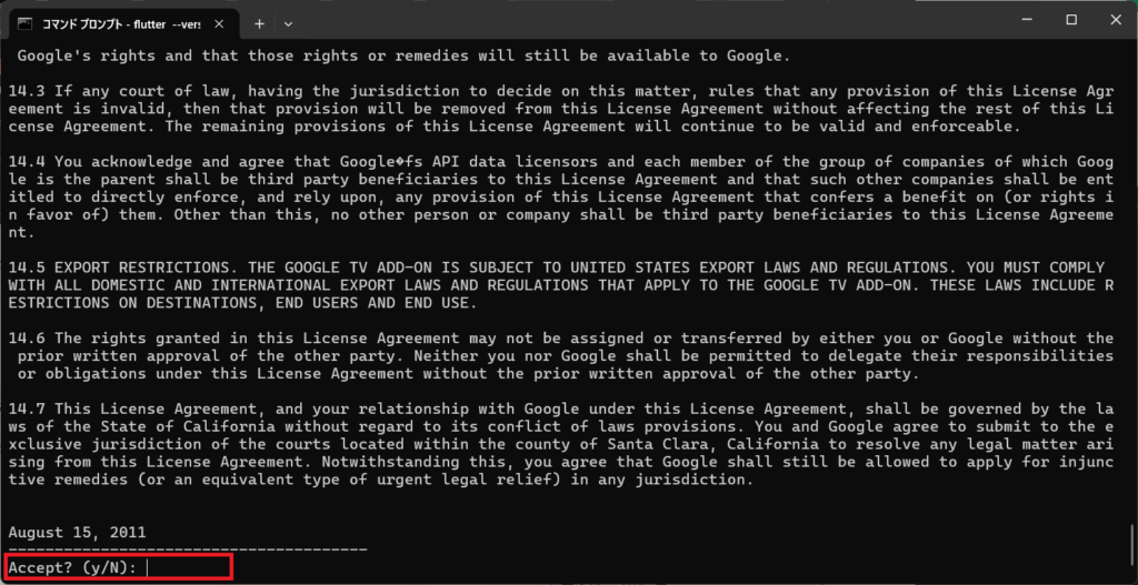 flutter doctor --android-licenses5回ほど同意のメッセージが表示されるので、すべて「y」を入力してEnterキーを押せば完了します。