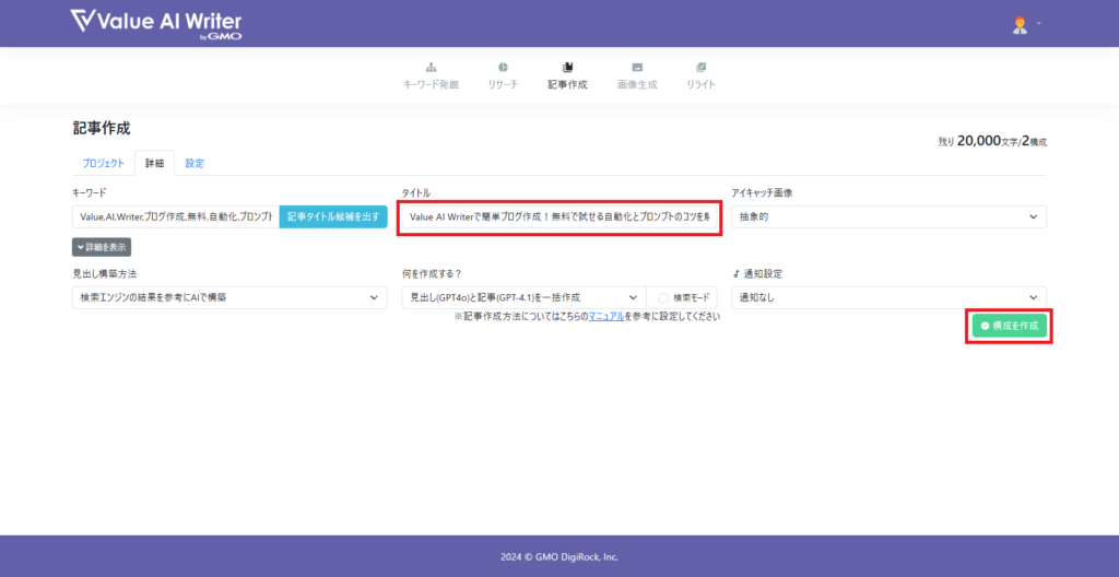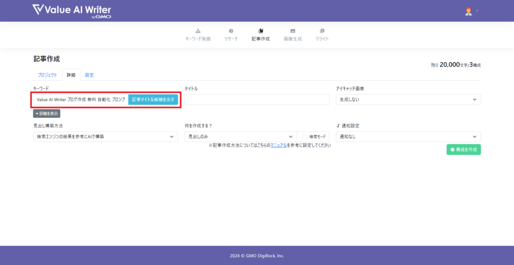 Value AI Writer にはもちろん、指定したキーワードや目的を入力するだけで、複数の構成案やタイトル案を自動で提案してくれる機能が備わっています。