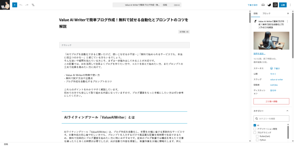キーワード:「AI」「ブログ作成」「自動化 プロンプト」「Value AI Writer」