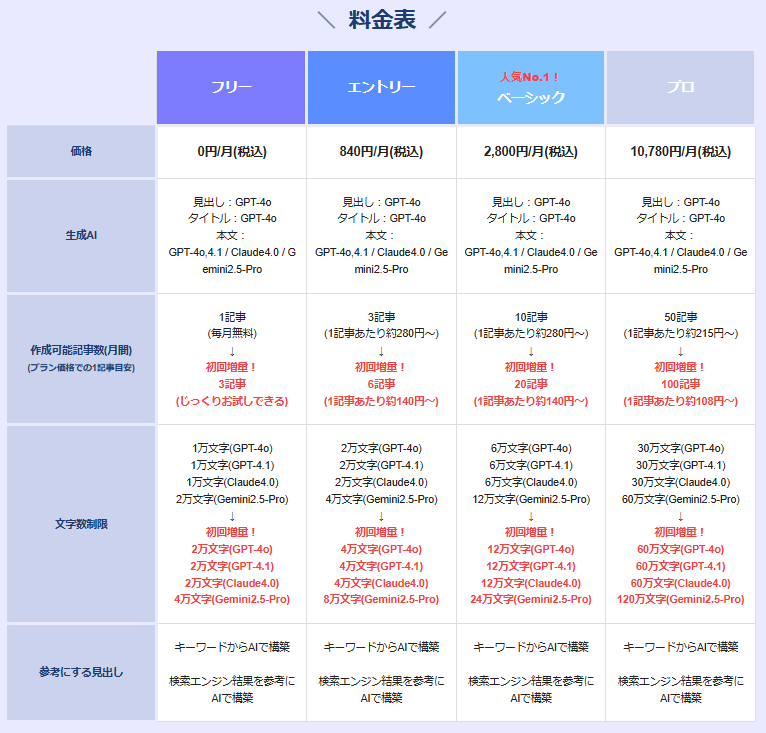 → 少量の記事作成に向く - ベーシック:月2,800円ほど