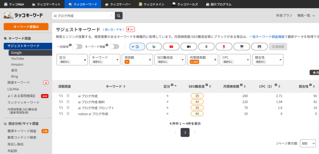 俺は本格派なので、ラッコキーワードの月額1000円ぐらいのプランを毎月購入してます!本腰入れたいってなったら、こういう有料サービスを申し込んでみるといいと思います。